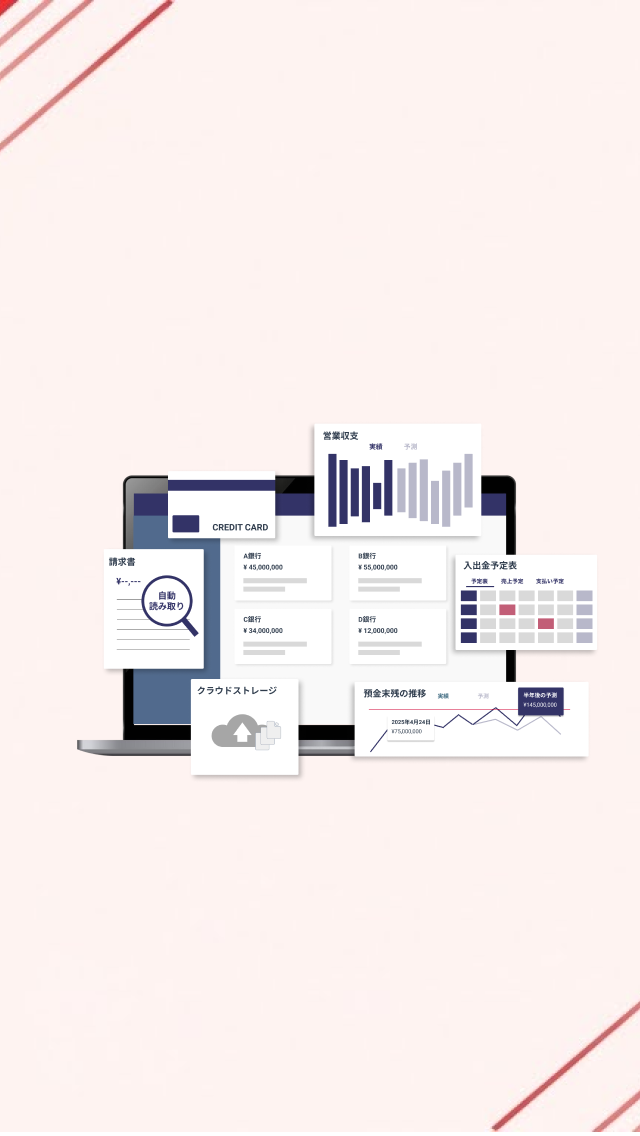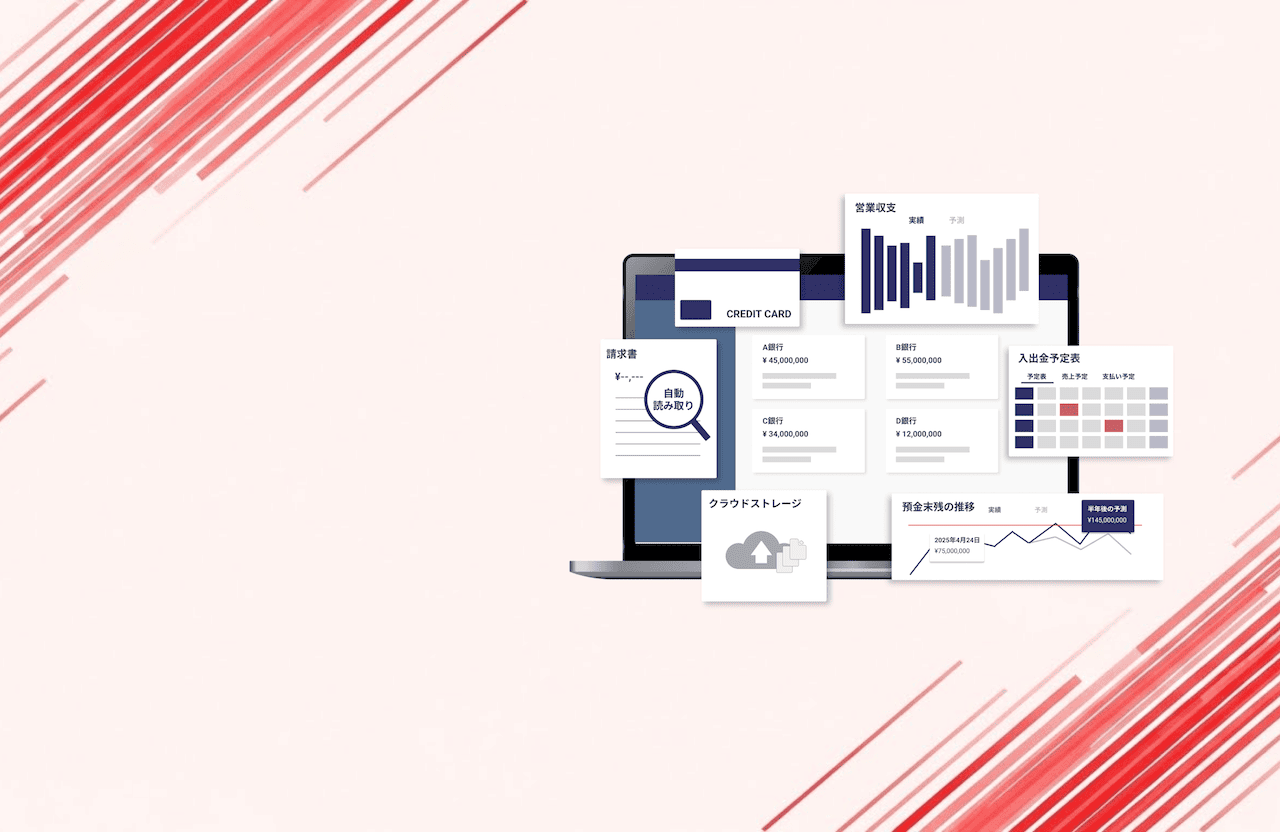 複数の銀行口座の残高・入出金をまとめて管理することができます。また、売上の入金予定や支払予定など資金繰り把握や経理業務のデジタル化の実現、インボイス制度や電子帳簿保存法にも対応できます。
